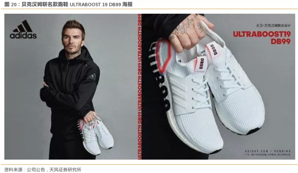 2019年阿迪达斯携手大卫·贝克汉姆联合推出ULTRABOOST 19 DB99,持续宣扬品牌的迸发精神和时尚态度。命名源于大卫‧贝克汉姆 (David Beckham) 的名字首字母缩写,而99正对应着于他而言格外重要的1999年。DB99跑鞋的设计灵感则源于贝克汉姆的人生经历,包含了他对过往人生的回顾和展望:在1999年,他与妻子完成了终身大事,也迎来了他们大儿子的降生;同年,他带领他所在的球队赢下了许多重要赛事的冠军,为俱乐部拿下了“三冠王”的称号。
