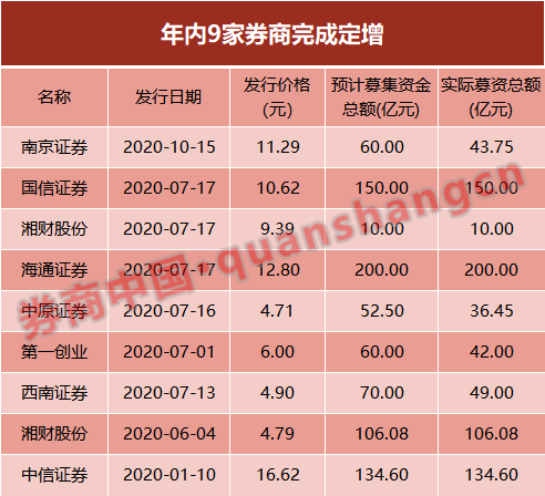 就定增来看,截至目前,已有国信证券、海通证券等9家券商完成定增发行,实际募资总额为771.88亿元,其中海通证券募集资金达到200亿元,为今年定增金额最高的券商。