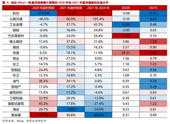 就大周期的横向比较来看,结合Wind一致盈利预测,综合2020年和2021年盈利增速和估值水平,经济复苏背景下,航空、公路交通、工业金属等更受益。