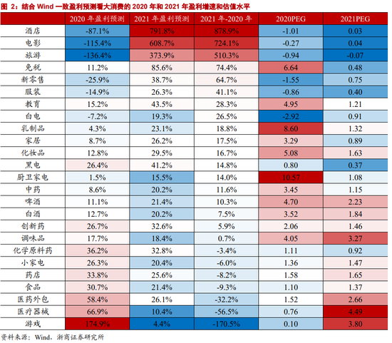 就大消费的横向比较来看,结合Wind一致盈利预测,综合2020年和2021年盈利增速和估值水平,可选类显著占优,包括酒店、电影、旅游、免税、教育、新零售等。