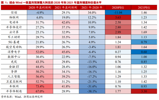 就大科技的横向比较来看,结合Wind一致盈利预测,综合2020年和2021年盈利增速和估值水平,可关注三条线索: