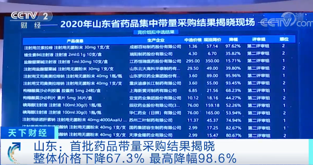 山东:首批药品带量采购结果揭晓 整体价格下降67.3% 最高降幅98.6%