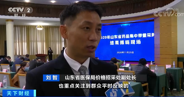 山东省医保局价格招采处副处长 刘智:药品采购平台上销售的规模是50个亿,市场的销售量非常大,而且我们在遴选的过程中也重点关注群众平时反映的价格比较高、医院用量大、患者受众面广的药品,这次带量采购结果产生以后,将能够很明显地降低患者的就医负担。