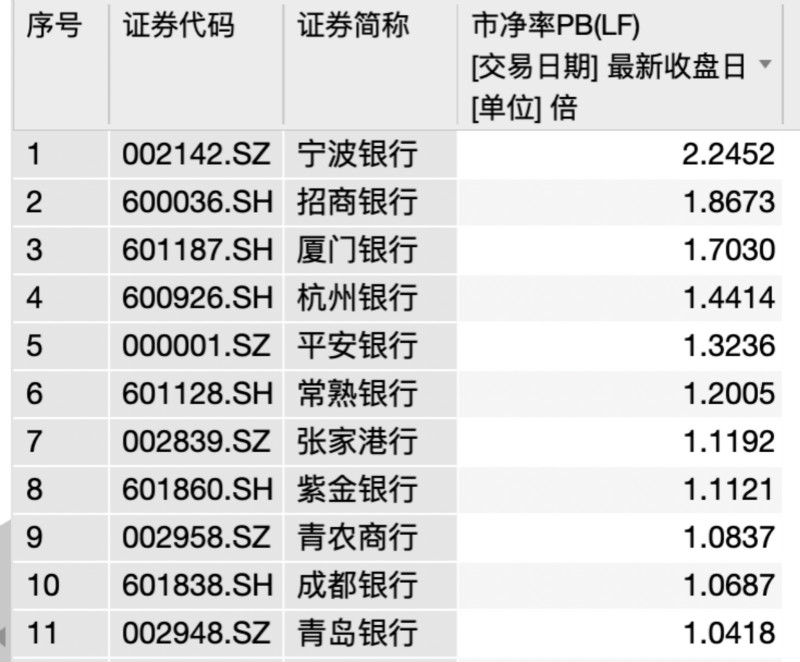 相比之下,宁波银行、招商银行、厦门银行、杭州银行等11家银行的市净率则处于1倍以上。其中,宁波银行最高,为2.25倍,招商银行为1.87倍,厦门银行和杭州银行分别为1.70倍和1.44倍,4家银行27日的股价涨幅分别为2.74%、1.69%、9.97%和3.76%。