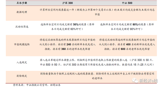 从成分股调整规则来看,指数定期调整的流程大致可以分为三个步骤,即数据准备,确定样本空间,筛选样本股。以沪深300和中证500指数为例,具体为,指数公司一般在每年5月和11月的下旬审核沪深300和中证500指数样本股,样本调整时间分为是每年6月和12月的第二个星期五的下一个交易日。