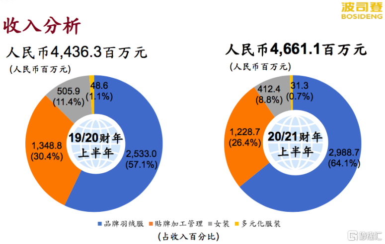 20/21财年上半年,贴牌加工管理业务取得收入约为12.29亿元人民币,占总收入的26.4%,同比下降8.9%;女装业务取得收入约为4.12亿元人民币,占总收入的8.8%,同比下降18.5%;多元化服装业务取得收入约为3130万元人民币,占总收入的0.7%,同比下降35.6%。目前,女装及多元化业务占比已经很小。