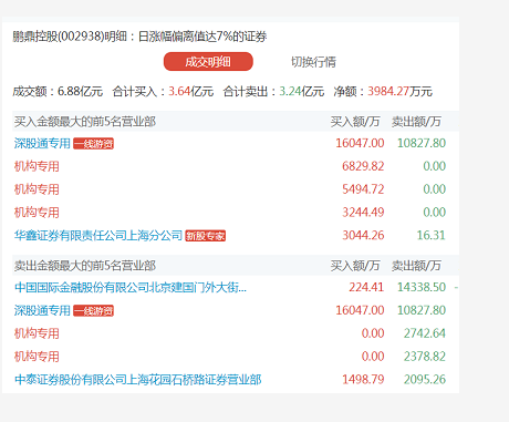 龙虎榜数据显示,鹏鼎控股获得机构大举买入,前五大买入营业部有3家机构买入,合计买入金额超过1.5亿元。前五大卖出营业部有两家机构,合计卖出超过5000万元。