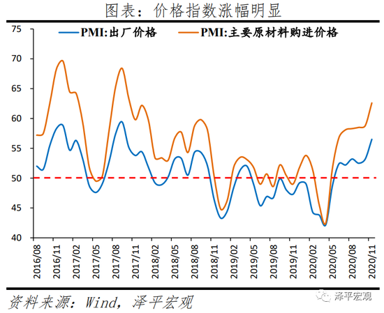 11月制造业PMI主要原材料购进价格指数和出厂价格指数分别为62.6%和56.5%,较上月上升3.8和3.3个百分点,达到年内高点。主因随着近期大宗商品价格普遍上涨,以及企业生产、采购活动加快。11月布伦特原油均价环比5.7%,南华工业品指数环比2.4%,螺纹钢环比5.9%。从行业看,上游产品价格上涨幅度更为明显,石油加工煤炭及其他燃料加工、化学原料及化学制品、黑色金属冶炼及压延加工、有色金属冶炼及压延加工等行业两个价格指数均位于60.0%以上高位景气区间。