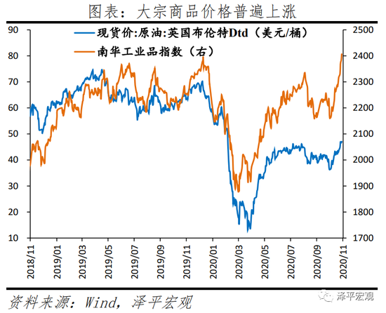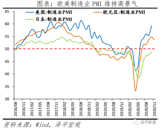 1)中国经济持续复苏。国内疫情防控得力,复工复产复商复市加快,经济自3月以来持续恢复。11月综合PMI、制造业PMI和非制造业PMI指数分别为55.7%、52.1%和56.4%,较上月上升0.4、0.7和0.2个百分点,均创年内新高。