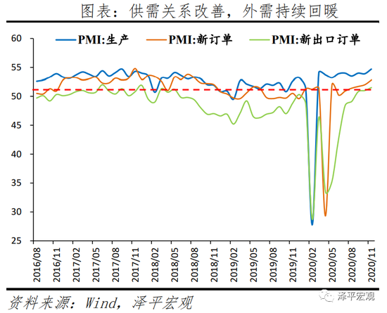 2)制造业供需显著改善。11月制造业生产和新订单指数分别为54.7%和53.9%,较上月上升0.8和1.1个百分点;欧美复工复产刺激外需回暖,11月新出口订单指数为51.5%,较上月上升0.5个百分点,连续三个月高于荣枯线。