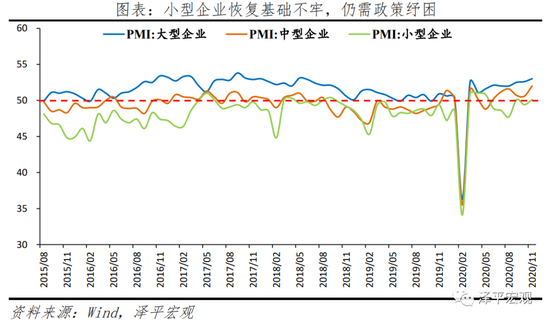 11月大中小型企业PMI分别为53.0%、52.0%和50.1%,较上月上升0.4、1.4和0.7个百分点,小型企业恢复慢于大、中型企业。小型企业生产指数和新订单指数分别为51.8%和50.5%,分别较上月上升0.1和0.8个百分点,供需两端有所恢复。但恢复基础不牢,资金紧张的小型企业占比为42.3%,仍需政策纾困。