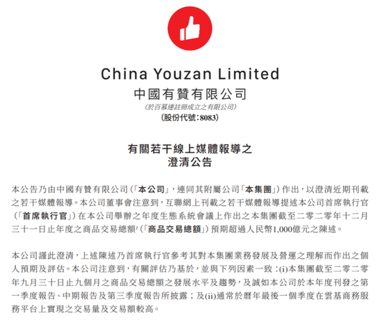 中国有赞:公司CEO作出交易总额1000亿的表述为其个人评估