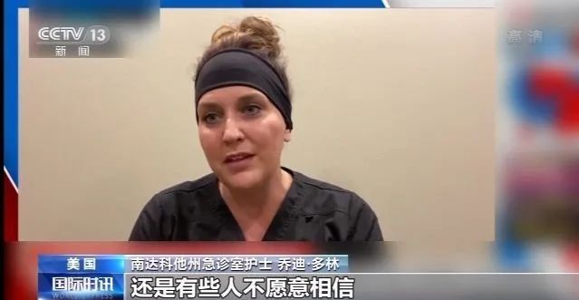 南达科他州某医院急诊室护士 乔迪·多林:人们会寻找很多借口说这不是新冠肺炎,他们会说这是流感,肺炎,甚至有人说这是肺癌。就算检测结果摆在面前,还是有些人不愿意相信。