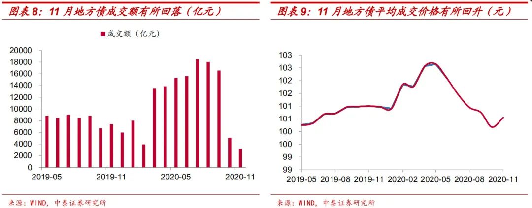 11月地方债成交量较10月有所回落,平均成交价格有所回升。11月地方政府债成交3201.50亿元,较10月明显回落,同比下降56.79%。11月平均成交价格100.55元,较10月小幅回升,成交收益率有所下降。