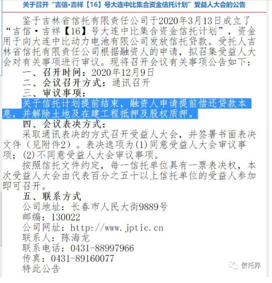 11月23日,吉林信托官网挂出了一份《关于召开“吉信·吉祥【16】号大连中比集合资金信托计划”受益人大会的公告》,融资人于2020年11月23日向我公司申请提前偿还贷款本息,并解除土地及在建工程抵押及股权质押,吉林信托将提前终止信托合同,需召开受益人大会。