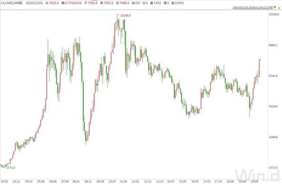 在基本金属里,伦铜涨幅最为耀眼。 LME铜价从1月16日的6300美元/吨下跌27%至3月23日的4617美元/吨;4-9月份南美产铜大国产量受卫生事件干扰供给持续紧张后,铜价强势反弹至6800美元/吨一 线;10-11月份产铜大国逐步恢复供给,在经济复苏的预期下铜价继续上行,于 11月31日升至7700美元/吨,较年初低点上涨约66%。
