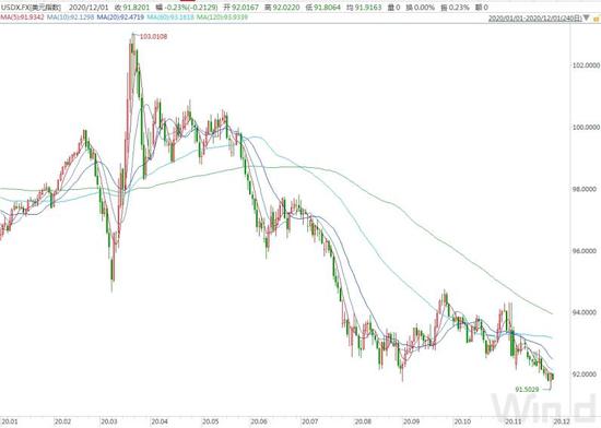 另一方面,美元进入贬值通道,对于美元结算的大宗商品也是潜在利好。11月31日,美元指数最低跌破92,美元指数较年内高点下跌约11%,整体2020年呈现下行走势。
