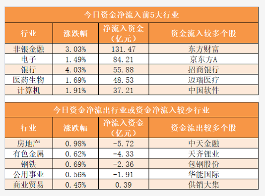28个申万一级行业中,24个行业实现资金净流入,其中非银金融行业净流入131.47亿元居首。