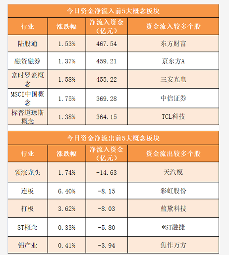 概念板块方面,今日陆股通、融资融券、富时罗素概念、MSCI中国等概念板块资金呈现净流入,其中陆股通概念净流入467.54亿元居首。