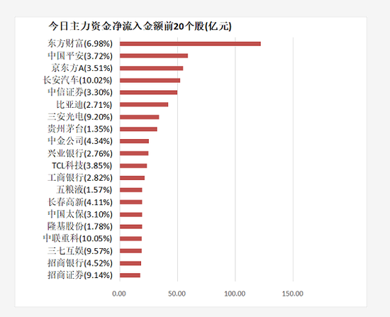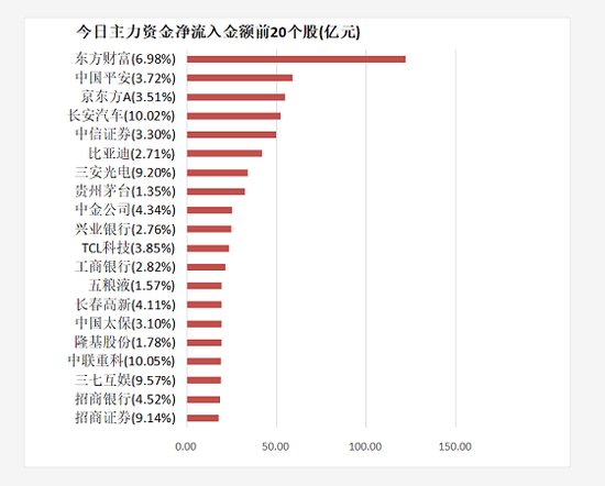 今日沪深两市主力资金开盘净流出5.74亿元,尾盘净流入49.57亿元,两市全天资金净流入117.46亿元。