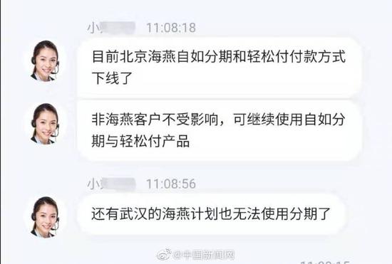 自如人工客服对此回复表示,目前北京海燕自如分期和轻松付付款方式已下线,还有武汉的海燕计划也无法使用分期。(彭婧如)