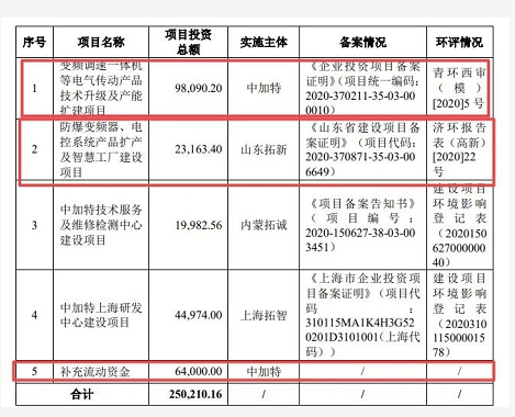 此次首发,中加特拟发行股数不超过6000万股,占发行后总股本比例不低于25%,计划募资25亿元,用于变频调速一体机等电气传动产品技术升级及产能扩建项目、防爆变频器、电控系统产品扩产等和补充现金流。