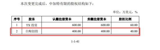 2011年,中加特前身中加特有限于2011年11月3日由TX INVESTMENT CORP.(以下简称“TX 投资”)、北京白鲸创业投资有限公司(已更名为“北京华夏天信白鲸创业投资有限公司”,以下简称“白鲸创投”)出资设立,具体如下:2011年 10月24日,TX投资与白鲸创投共同签署《青岛天信变频电机有限公司章程》,约定共同出资设立中加特有限,投资总额为2000万美元,有限公司注册资本为1000万美元,其中白鲸创投认缴400万美元出资额,TX 投资认缴600万美元出资额。