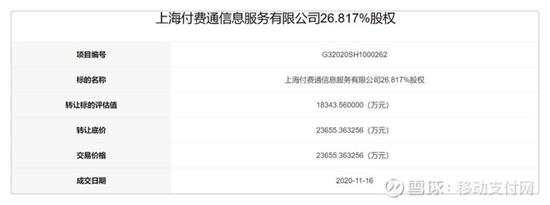 近日,上海联合产权交易所一则产权成交公告显示,第三方支付公司上海付费通信息服务有限公司(下简称“付费通”)26.817%股权以23655.363256万元(约2.37亿元)价格,已于11月16日成交。按照成交价,付费通总值约8.83亿元。