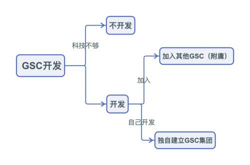 若是走GSC的路线,要考虑科技是否强大[8]。要不要开发自己的GSC,取决于本国科技实力。如果这路线走通,在数字货币战争中将十分有利。若具体平台开发的路线有二,一是自己开发将形成独立的GSC集团,二是加入别人的GSC阵营成为附庸。[5]