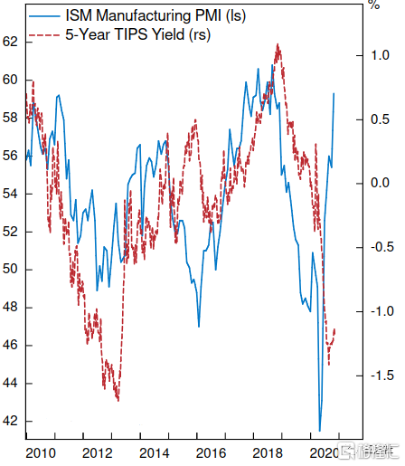 随着经济复苏正在展开,大规模政策刺激可能性下降,黄金下行风险增多。此外,经济复苏驱动美债实际利率不断上升(图11),将拖累黄金价格。