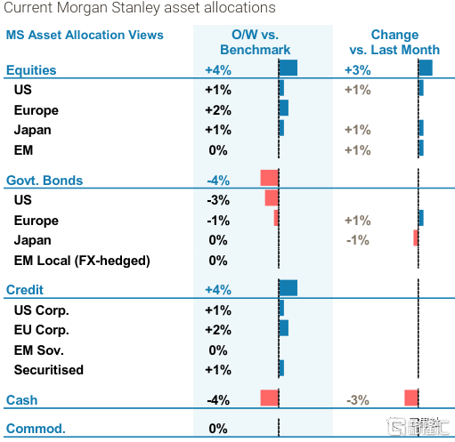 鉴于全球股市的风险溢价率仍然较高(图2),大摩建议超配全球股市和信用债(图3),低配现金和欧美国债。和高盛一样,大摩也看空美元,同时对大宗商品持谨慎乐观看法。