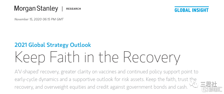 在高盛报告发布的一周后,老对手摩根士丹利也发布了自己的《2021年全球策略展望》。该报告同样围绕经济复苏展开,其大类资产观点也与高盛存在相通之处。