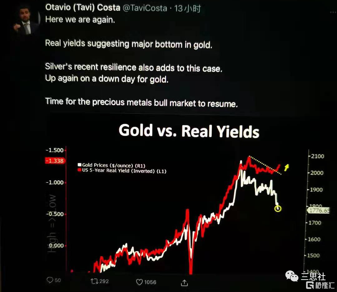 从基本面方面,大摩提出的实际利率上升将拉低黄金价格的逻辑,有不少知名投资者提出异议(下图),认为实际利率仍未摆脱下跌趋势,而黄金价格在挤出拥挤仓位后还有补涨空间。