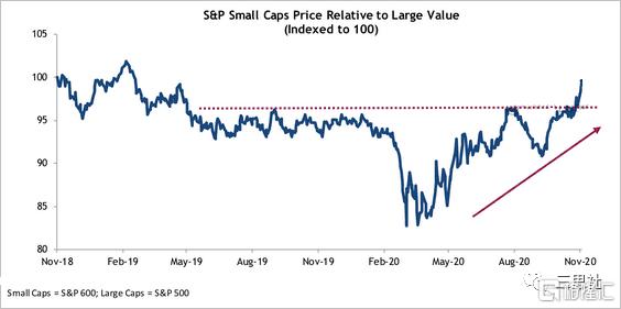 市场风格选择上,大摩建议超配价值型小盘股,对高估值的大盘成长股保持谨慎,后者易受利率上行冲击。实际上,在2010年,美股小盘股的涨幅几乎是标普500指数的两倍;近期,价值型小盘股跑赢势头已非常明显(图6)。