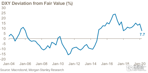 大摩认为,明年美元继续下跌的催化剂包括新冠疫苗获批及推广、英国顺利脱欧、欧盟复苏基金的投资资金等。大摩估算,目前美元指数被高估10%(图7),这意味着在明年的弱美元周期下,美元至少将下跌10%。