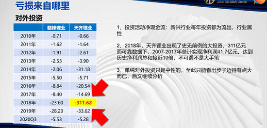 继续追根溯源,在两家企业的净现金流中有一个异常数字,2018年天齐锂业出现了史无前例的对外投资,接近312亿元 ,而天奇锂业在2007年-2017年共实现净利润41.7亿元 ,对外投资近历史利润总和的近8倍笔。