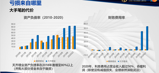 从资产负债率来看,2010年-2020年大部分时间中,两家公司的资产负债率基本都以40%为中枢来回震荡,相比之下赣锋锂业的资产负债率大部分时间都低于天齐锂业。但2018年天齐锂业的资产负债率飙升至近80%后,尽管300多亿的并购资金大部分应该是来源于融资,但其2020年利息费用占到营业收入超过50%,吞噬了大部分的利润,也就是说即使没有减值损失,它的业绩依然会受到不小的影响。