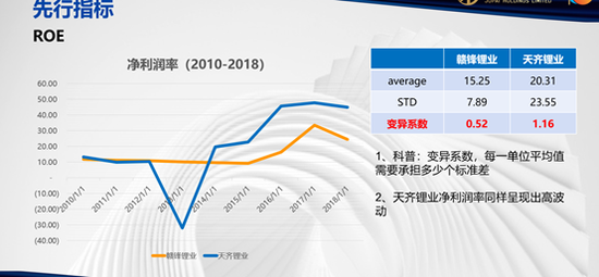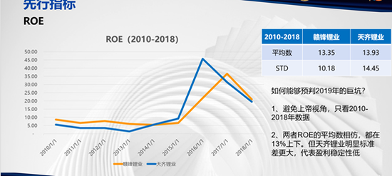 看一下这两家公司在巨变前2010年到2018年ROE数据:天齐锂业在2014年前ROE是低于赣锋锂业的,2014年之后反超,2017年又被赣锋锂业反超。赣锋锂业8年的ROE平均水平是13.35,天齐锂业是13.93,数值相近。但实际上再深层次的去看它的标准差,赣锋锂业是10.18,而天齐锂业是14.5。、