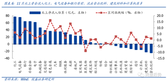 北上流入步伐明显提速,11月净流入创年内新高。11月以来,我们观察到北上资金流入节奏明显加快,上旬累计净流入超300亿元,月中经历阶段盘整后,下旬又再度发力,单月北上累计增持达到579.3亿元,创下年内单月净流入新高。配置盘与交易盘在同步流入,根据我们的估算,11月配置盘资金流入规模约254.17亿元,而交易盘净流入规模约334.04亿元。