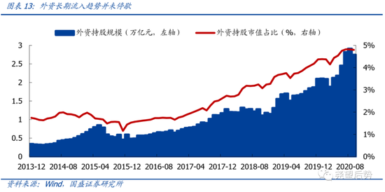 最后,外部环境趋于改善,交易盘有望重回净流入,预计全年外资增量在2000-3000亿。截至2020年三季度末,A股外资持股占流通市值比例约为4.8%,明显低于成熟市场,A股外资配置初级阶段的现状与“水向低处流”的趋势仍然成立。同时,对于2021年而言,中国的抗疫成果带来的基本面优势持续,拜登入主白宫后中美经贸关系的稳定化,以及人民币持续升值预期等,都有利于交易型外资的增持,在摆脱疫情困扰与中美极端碰撞后,明年交易盘有望重回净流入。保守预测下,2021年外资增量将达到2000-3000亿元。