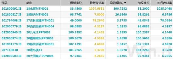 信用债行情整体趋于稳定,少数债券波动较大。永煤控股“18永煤MTN001”最新净价涨近391%,报33.45元。中国恒天集团“18恒天MTN001”涨近27%,报98.78元。冀中能源集团“16冀中能源MTN001”最新净价跌逾13%,报69.5元。山西潞安矿业“20潞安PPN004”最新净价跌逾10%,报88.08元。