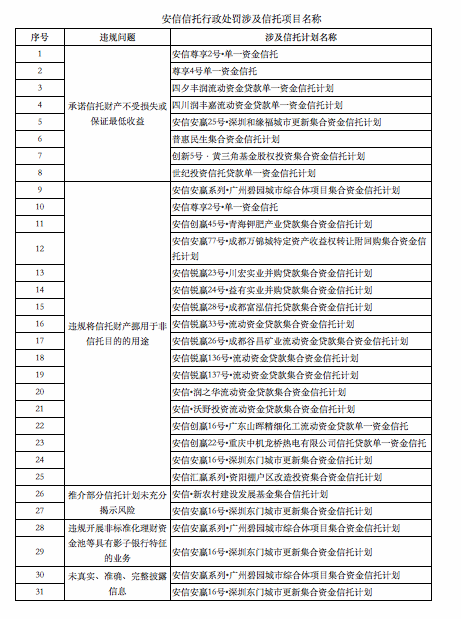 6月,根据《政府信息公开条例》等相关规定,上海银保监局公开了安信信托《行政处罚决定书》(沪银保监银罚决字〔2020〕4号)涉及的违规项目问题与名称,共31条。