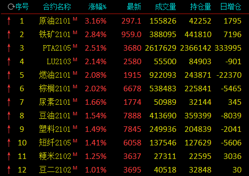 热点栏目12月4日,国内期市早盘多数品种上涨,原油涨逾3%,铁矿石涨近3%,PTA、燃油涨逾2%,橡胶大跌逾5%,20号胶跌逾4%;油脂飘红,棕榈油涨逾2%,豆油涨逾1%,豆一跌逾2%;有色分化,沪铜涨近1%,沪镍、沪铝下跌。