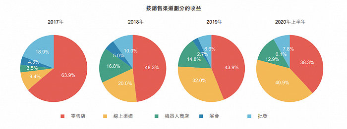 2020年上半年,由于受到疫情影响,泡泡玛特的营收和净利增速均出现了一定程度的放缓,但营收仍达到8.18亿,净利润也在1.41亿以上。这主要是因为,泡泡玛特早前已经逐渐完成了线上渠道的拓展,线上的收益贡献从2017年的9.4%逐步上涨到2020年上半年的40.9%,消解了疫情对泡泡玛特线下业绩的部分冲击。