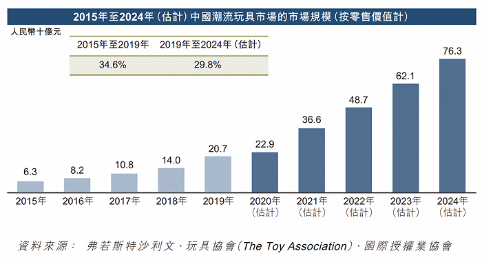 弗若斯特沙利文数据显示,2015年-2019年,中国潮流玩具零售的市场规模从63亿元上涨至207亿元,复合年增长率为34.6%,而在全球潮玩零售市场,同期的年复合增长率则为22.8%。同样,预计到2024年,国内的市场规模将上涨至763亿元,复合年增长29.8%,同期全球市场的预期复合年增长16.1%。