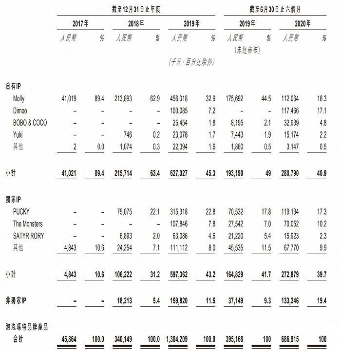 具体的表现是,2020年上半年,泡泡玛特来自MOLLY相关产品的收益从上年同期的1.75亿降至1.12亿。同时,泡泡玛特开始加快IP推新的速度,2020年上半年,平台便推出16个新IP,下半年的上新预期也达到14个,平均每个月将推出2~3个新IP。