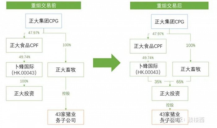 在收购43家猪业务公司的交易完成后,正大投资的股权结构将相应变为:卜蜂国际拥有35%股权,正大畜牧拥有65%股权。