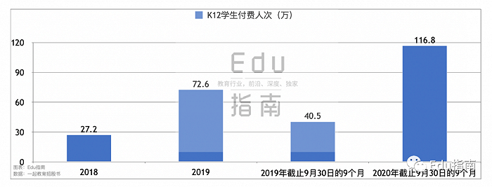 更具体的经营数据,包括一起教育在k12网课辅导端的付费课程人次(付费99元及以上的课程):2018年是27.2万人次,2019年是72.6万人次。在2020年前9个月,这个数字是116.8万人次,同比去年前九个月的40.5万增加1.88倍。