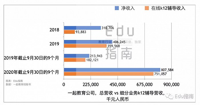 k12辅导网课,在2018年、2019年以及截至2020年9月的9个月,为一起教育贡献营收比例分别达:30%、89%、93%,收入数据分别约为9390万元人民币、3.60亿元、7.51亿元。