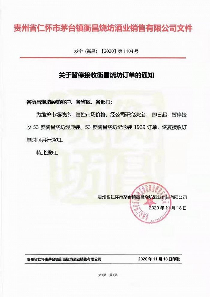12月1日,衡昌烧坊发布了第二次提价通知,调整经典装出厂价。这是衡昌烧坊继11月6日后在近一个月内第二次提价。